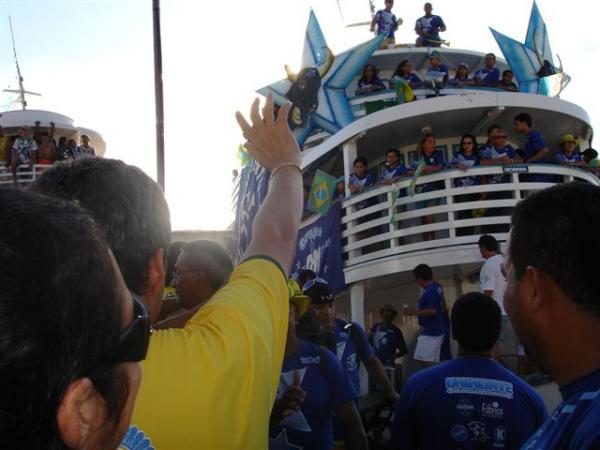 Festa azul no rio Amazonas. A chegada do barco que trouxe os integrantes do Movimento Marujada a Parintins incendiou a orla da cidade com fogos de artifício e muita toada de boi-bumbá. A embarcação chegou às 16 horas, quando os termômetros do Festival Folclórico de Parintins registravam temperatura em elevação na Ilha do boi.