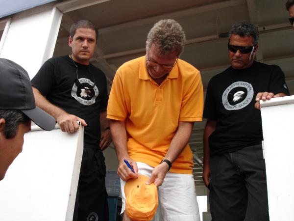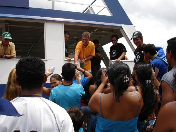 Parintins AM - O jornalista Pedro Bial provocou frisson ontem no Porto de Parintins, na passagem da Caravana JN pela ilha dos Bois Caprichoso e Garantido. Depois de quase incorporar o boto tucuxi no paraíso da festa do Çairé, em Alter do Chão PA, o jornalista visitou Parintins num dia de folga, estava bem humorado, deu autógrafos, posou para fotos, disse que a paisagem da Amazônia o emudece e declarou: o que mais me comove na Amazônia é o povo, que apesar de aparentemente distante dos grandes centros, está muito bem informado, consciente do valor do seu voto, do seu trabalho e da sua importância na construção do Brasil.