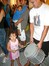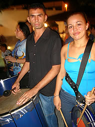 ![]() Marcos Cecílio, 20 anos de Marujada, e sua esposa Ana Paula | ![]() Jorge Portela tocava pagode, agora quer Boi | ![]() A pequena Letícia, filha de Anderson, arrisca uma batida no repique |